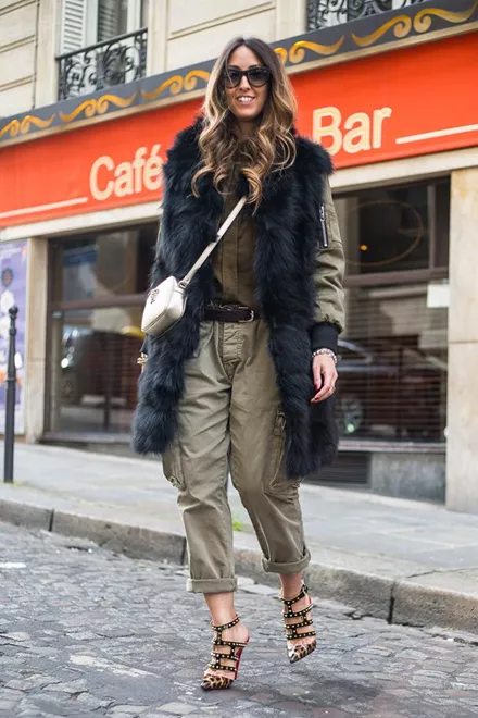 Το military στυλ προσδίδει πάντα δυναμισμό και γοητεία. Εδώ το cargo παντελόνι συνδυάζεται με midi γούνινο παλτό και parka σε ένα look που καταφέρνει να ξεχυλίζει θηλυκότητα.