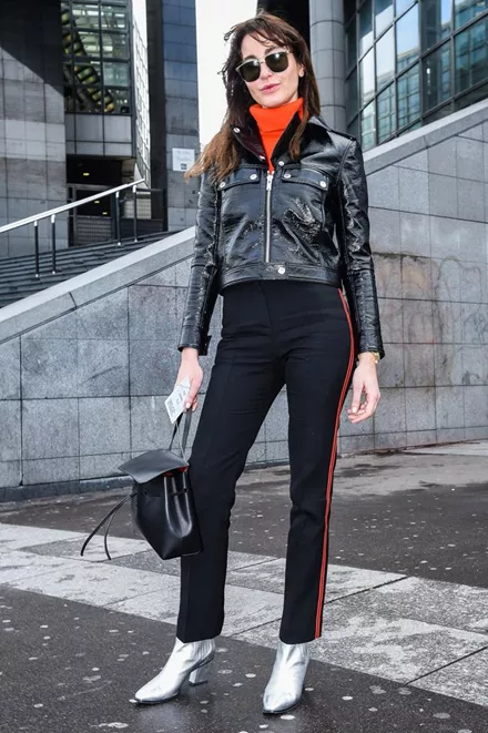 Μπορείς να υιοθετήσεις το athleisure look ακόμα κι αν είσαι άνω των 40; Ναι! Επίλεξε ένα ψηλόμεσο παντελόνι με ρίγα στο πλάι, ζιβάγκο και δερμάτινο τζάκετ για sporty 60s style.