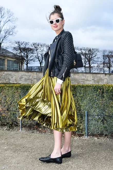 Η midi φούστα σε μεταλλική απόχρωση είναι ένα από τα νέα βασικά κομμάτια της γυναικείας γκαρνταρόμπας