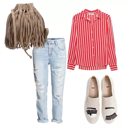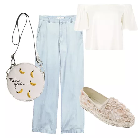 Ανοιχτόχρωμο jean σε boyfriend γραμμή, H&M, 29.99 ευρώ, www.hm.comΈξωμο τοπ με βολάν, BSB, 39.90 ευρώ, www.bsbfashion.comΕσπαντρίγια, Keep Fred, 39.00 ευρώ, www.keepfred.grΤσάντα ώμου από οικολογικό δέρμα, Axel, 73.00 ευρώ, www.axelaccessories.com