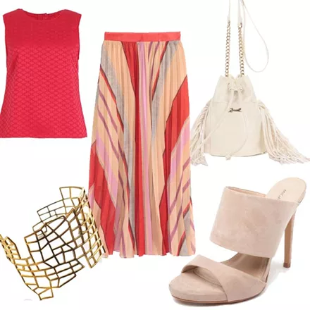 Μίντι σιφόν φούστα Η&Μ, 49,99 ευρώ, hm.com/grΦούξια σατέν τοπ e-xclusive, 29,00 ευρώ, e-xclusive.comΜπεζ mules MIGATO, 60,00 ευρώ, migato.comΠουγκί με κρόσσια Axel, 45,00 ευρώ, axelaccessories.comΒραχιόλι κατασκευασμένο στο χέρι από μπρούτζο B-MADE, 88,00 ευρώ,designisthis.com