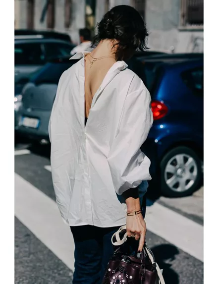 Φόρεσε το κλασικό πουκάμισο ανάποδα δημιουργώντας ένα τολμηρό αντίστροφο ντεκολτέ.