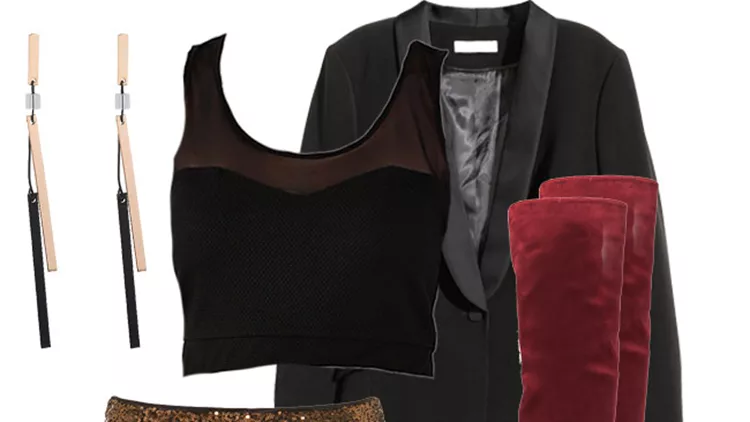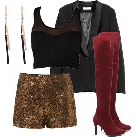 Σορτς με παγιέτες, Pink Woman Dutchess Collection, 19.90 ευρώ, www.pinkwoman-fashion.comΤοπ, 18 ευρώ, www.e-xclusive.comΣακάκι, H&M, 44.90 ευρώ, www.hm.comΜπότες, MIGATO, 77 ευρώ, www.migato.comΣκουλαρίκια, Achilleas Accessories, 4.83 ευρώ, www.achilleasaccessories.gr