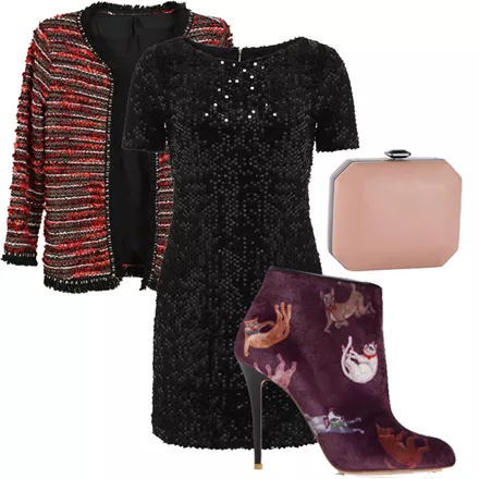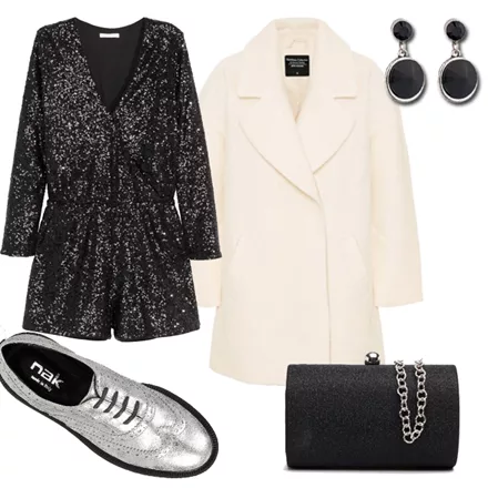 Sequined playsuit, H&M, 49.99 ευρώ, www.hm.comΠαλτό με μάλλινη σύνθεση, Pink Woman, από 49.99 ευρώ τώρα 34.99 ευρώ, www.pinkwoman-fashion.comΔετά παπούτσια, NAK, 129 ευρώ, www.nak.grΜαύρο clutch με glitter, Migato, 38 ευρώ, www.migato.comΣκουλαρίκια Sharona, Achilleas Accessories, από 6.90 ευρώ τώρα 4.83 ευρώ, www.achilleasaccessories.gr