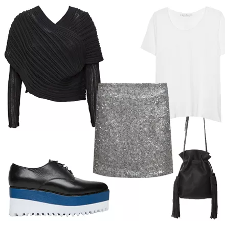 Μίνι φούστα με παγιέτες le4avril, 168,00 ευρώ, stylebubbles.comT-shirt Ripped Cotton, 48,00 ευρώ, stylebubbles.comΠολυμορφική ζακέτα Ioanna Kourbela, 52,50 ευρώ, stylebubbles.comFlatform brogues Jeffrey Campbell, 165,00 ευρώ, stylebubbles.comΔερμάτινη τσάντα πουγκί Park House, 180,00 ευρώ, stylebubbles.com