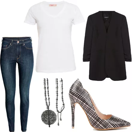 Skinny Τζιν H&M, 19,99 ευρώ, hm.comBasic Top Pink Woman, 5.99 ευρώ, pinkwoman-fashion.comΛευκή καρό γόβα Migato, 47,00 ευρώ, migato.comΜακρύ Σακάκι BSB, 99,00 ευρώ, bsbfashion.comΚολιέ με σχήμα δέντρο JamJar, 45,00 ευρώ, jamjar.gr