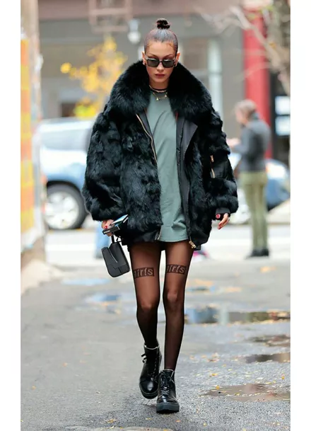 Φόρεσε το μαύρο γούνινο πανωφόρι όπως η Bella Hadid. Με ένα ημιδιάφανο καλσόν με graphic σχέδια και ένα μακό φούτερ/φόρεμα, για τέλειo athleisure στυλ.