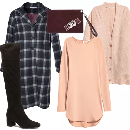 Φόρεμα κρεπ H&M, 19,99 ευρώ, hm.comΖακέτα πλεκτή H&M, 34,99 ευρώ, hm.comΠανωφόρι oversized Helmi, 39,90 ευρώ, helmi.grΜπότες Tamaris, 79,00 ευρώ, verona-shoes.grΤσαντάκι Axel, 20,86 ευρώ, axelaccessories.com