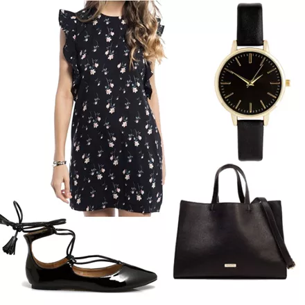 Φόρεμα Εμπριμέ, Helmi, 42,42 ευρώ, www.helmi.grΜπαλαρίνες, Bozikis, 14,99 ευρώ, www.bozikis.grΜαύρη τσάντα με κοντή λαβή, 57,00 ευρώ, www.migato.comΡολόι, H&M, 17,99 ευρώ, www.hm.com