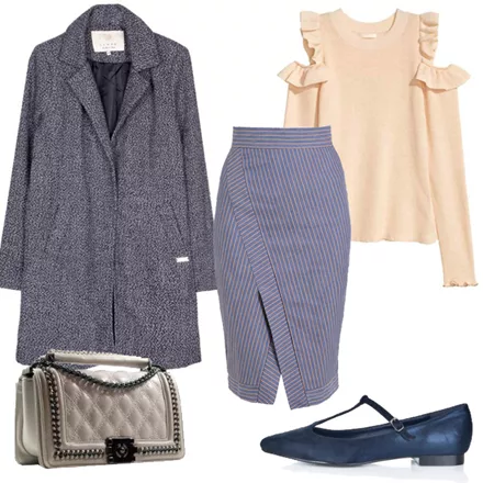 Ριγέ τζιν κρουαζέ φούστα e-xclusive, 17,00 ευρώ, e-xclusive.grΈξωμη μπλούζα με βολάν H&M, 29,99 ευρώ, hm.comΜπαλαρίνες με λουράκι Axel, 22,50 ευρώ, axelaccessories.comΤσάντα καπιτονέ Lydc, 42,00 ευρώ, favela.grΠαλτό Lynne, 44,90 ευρώ, lynne.com