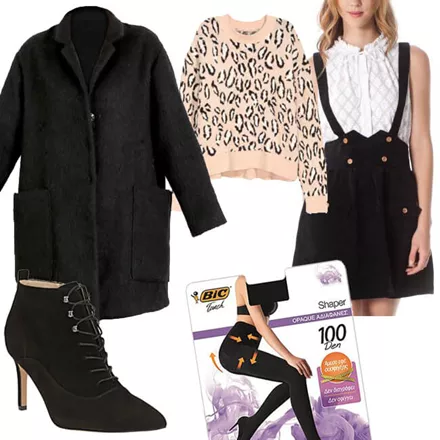 Παλτό e-xclusive, 85,00 ευρώ, e-xclusive.comΠλεκτό πουλόβερ H&M, 29,99 ευρώ, hm.comΦούστα με τιράντες attrattivo, 29,90 ευρώ, attrattivo.grΜποτάκια Clarks, 75,00 ευρώ, verona-shoes.grΚαλσόν οπάκ με λαστέξ, BIC Shaper