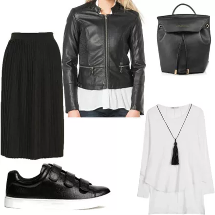 Μπουφάν δερμάτινο Attrattivo, 49,90 ευρώ, attrattivo.grΑσύμμετρη μπλούζα με κολιέ, 34,90 ευρώ, bsbfashion.comΦούστα midi Pinkwoman, 7,99 ευρώ, pinkwoman-fashion.comΑθλητικά Η&Μ, 24,99 ευρώ, hm.comΤσάντα Axel, 29,00 ευρώ, axelaccessories.com