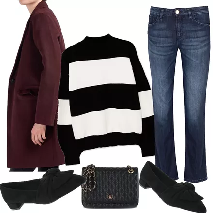 Μαύρες μπαλαρίνες, €17,90 iqshoes.grΜπορντώ παλτό σε ανδρικό κόψιμο, €39.99, IssueFashion.grCropped τζιν, €55,90 BSBΠουλόβερ ριγέ με φουσκωτό μανίκι, €25,99 MangoΧιαστί τσάντα ώμου καπιτονέ, €21.99 IssueFashion.gr