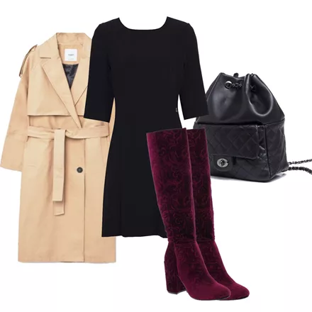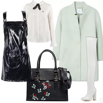 Πουκάμισο μακρυμάνικο με φιόγκο attrattivo, 34,90 ευρώ, attrattivo.grΒινύλ σαλοπέτα φούστα BSB, 34,95 ευρώ, bsbfashion.comΜυτερές μπότες over the knee Bozikis, 20,00 ευρώ, bozikis.grΠαλτό Mango, 79,99 ευρώ, mango.comΤσάντα με κεντήματα Migato, 30,00 ευρώ, migato.com
