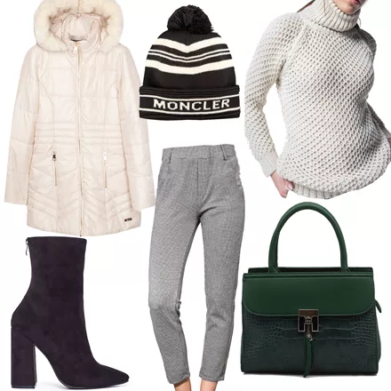 Πλεκτή μπλούζα Helmi, 29,90 ευρώ, helmi.grΜπουφάν φουσκωτό Lynne, 76,30 ευρώ, lynneshop.comΠλεκτό σκουφί Moncler, 128,00 ευρώ, atticadps.grΚαρό παντελόνι Fullah Sugah, 25,19 ευρώ, fullahsugah.grΜποτάκι Migato, 55,00 ευρώ, migato.comΤσάντα μικρή Bozikis, 29,99 ευρώ, bozikis.gr