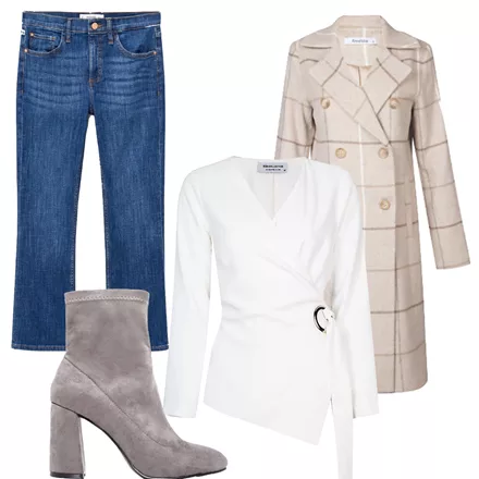 Κρουαζέ μπλούζα με κρίκο, €41,90 BSBΓκρι ψηλοτάκουνο μποτάκι, €45,00 MIGATOΤζιν παντελόνι flare Trumpet, €29,99 MANGOΚαρό Μάλλινο Παλτό – Μπεζ, €132,50 Anna Riska