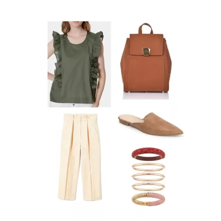 Τοπ με βολάν και ανοιχτή πλάτη 24.90 ευρώ, regalinas.grΨηλόμεσο παντελόνι 59.99 ευρώ, shop.mango.comΣακίδιο πλάτης 34 ευρώ, axelaccessories.comΣετ με βραχιόλια 18 ευρώ, accessorize.comMules 47.90 ευρώ, dexim.gr