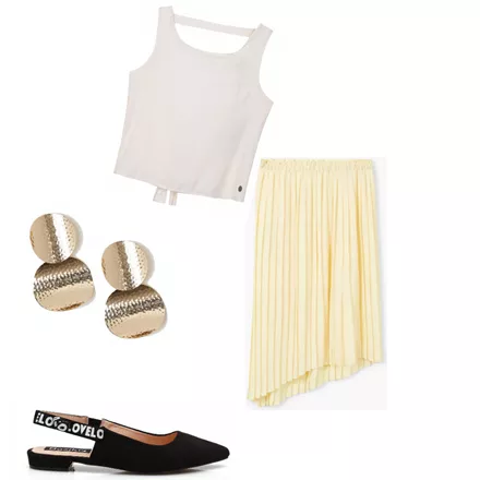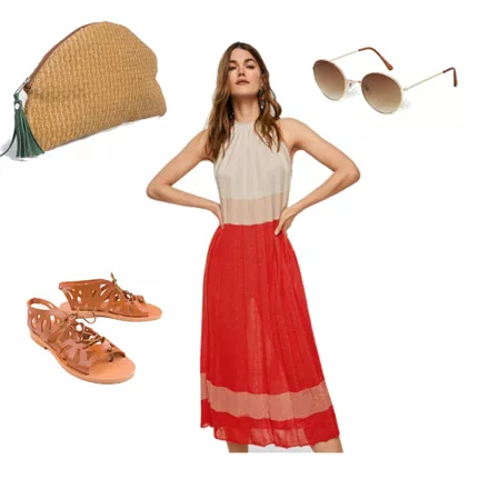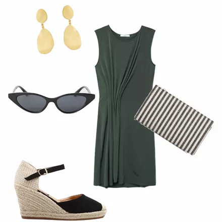Φόρεμα με πλισέ λεπτομέρειες €29,99 mango.comEspadrilles €29,99 bozikis.grΣκουλαρίκια €110,00 Li – LA – LO, notos.grΦάκελος τσάντα €38,70 IF by AXELΓυαλιά ηλίου €9,99 hm.com