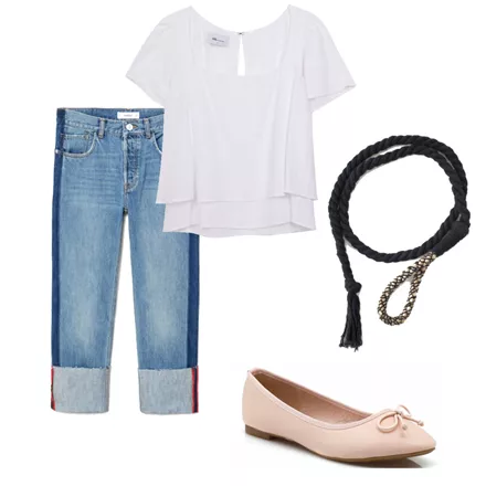 Λευκό top με τετράγωνη λαιμόκοψη €44,90 BSBΤζιν με γυρισμένα ρεβέρ €35.99 mango.comΖώνη μέσης από σπάγκο €6,90 attrattivo.grΜπαλαρίνες €9,99 bozikis.g