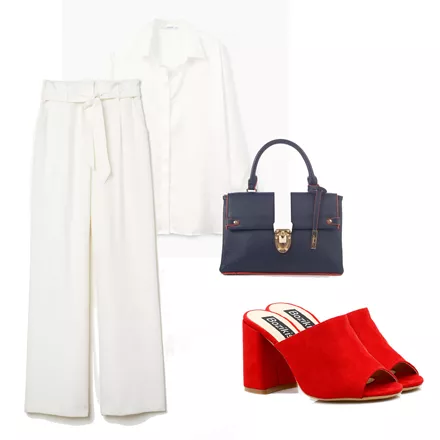 Mules, 19.99 ευρώ, www.bozikis.grΠαντελόνα, 34.99 ευρώ, www2.hm.comΤσάντα, 47.20 ευρώ, www.axelaccessories.comΣατέν μπλούζα, 29.99 ευρώ, shop.mango.com