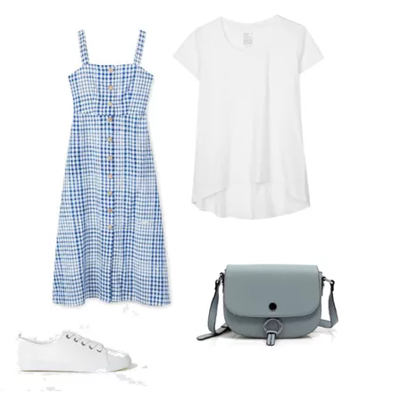Φόρεμα καρό vichy, Mango, 39.99 €, shop.mango.comΛευκό T-shirt, BSB, 24.90€, www.bsbfashion.comTrainers, H&M, 19.99€, www.hm.comΤσάντα city, Bozikis, 14,99€, www.bozikis.gr