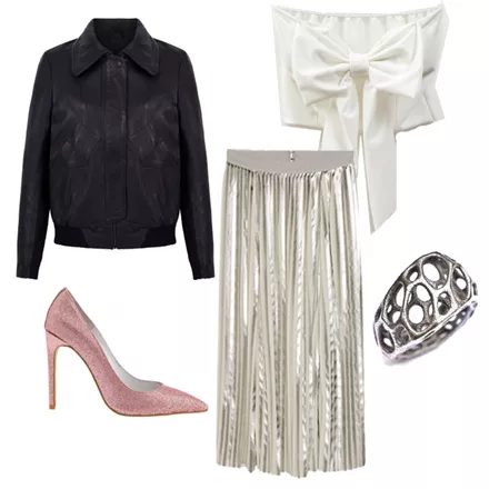Μπούστο με φιόγκο, 17.00 ευρώ, www.macadamiafashion.comPleated skirt, 49.99 ευρώ, www.hm.comΔερμάτινο jacket, 443.52 ευρώ, www.graziashop.comΓόβες Jeffrey Campbell, από 140.00 ευρώ, τώρα 70.00 ευρώ, www.favela.grΔαχτυλίδι από ατσάλι, 44.00 ευρώ, www.designisthis.com