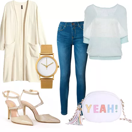 Τζιν attrattivo, 59,90 ευρώ, store.attrattivo.grTop Axel, 71,00 ευρώ, axelaccessories.comΖακέτα μακριά H&M, 29,99 ευρώ, hm.com/grΤσαντάκι Anna Smith, 27,00 ευρώ, favela.grΓόβες μεταλλιζέ e-xclusive, 99,00 ευρώ, e-xclusive.comΡολόι Extra Normal, 180,00 ευρώ, designisthis.com