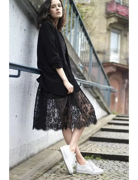 Συνδύασε ένα μακρύ blazer με μία δαντελένια φούστα. Η δαντελένια φούστα που πρωταγωνίστησε στους γάμους του καλοκαιριού μπορεί να φορεθεί και το φθινόπωρο με αυτό τον τρόπο!