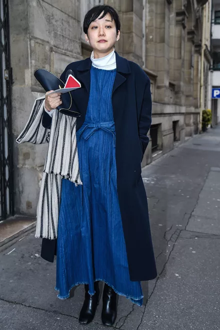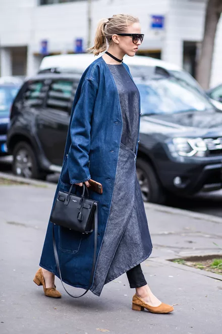 Total denim layering; Ναι, με μαντό, φόρεμα και skinny τζιν σε διαφορετικές αποχρώσεις.