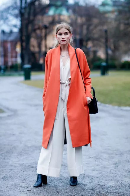 Ποιος είπε ότι ο Χειμώνας απαιτεί μουντά χρώματα; Εδώ η κρεμ ολόσωμη φόρμα φωτίζεται από ένα κοραλλί παλτό.