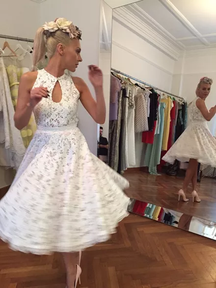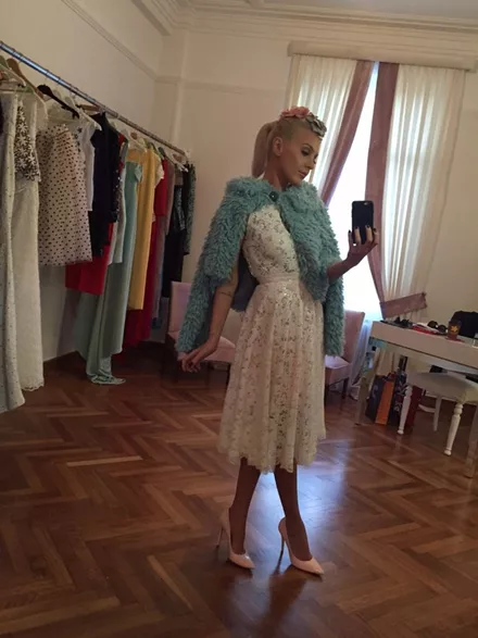H φούστα σε γραμμή 50's & το τοπ με τους παρτούς ώμους και το decollete σε σχήμα δάκρυ από λευκή δαντέλα με παγέτες σε συνδυασμό με το βεραμάν ζακετάκι, συνέθεσαν το απόλυτο ανοιξιάτικο look της γνωστής τραγουδίστριας και κριτή του XFACTOR, η οποία παραμένει πάντα πιστή στις συμβουλές της στυλίστριας της Αλεξάνδρας Κατσαίτη.
