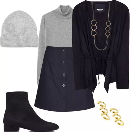 Ασσύμετρη ζακέτα σουέντ €69,90, BSBΖιβάγκο πουλόβερ €12,99, MangoDenim Φούστα- Μπλε €68,00, Milk & HoneyΜαύρο σουέντ μποτάκι €50,00, MIGATOΜακρύ κολλιέ €22,90, ΆLEΧρυσά δαχτυλίδια €37.00, kondessa.comΣκούφος €12,99, Mango