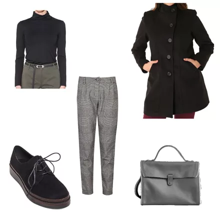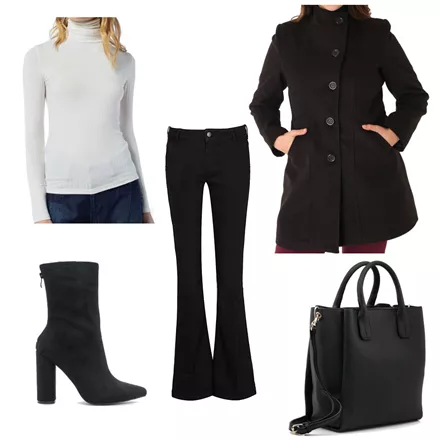 Μαύρο καμπάνα τζιν, BSB, 79,90 €, www.bsbfashion.comΜπλούζα ζιβάγκο, Helmi, 24,90 €, www.helmi.grHμίπαλτο με λοξό κούμπωμα, Parabita, 129,90 €, www.parabita.comΜαύρο σουέντ ψηλοτάκουνο μποτάκι, Migato, 60,00 €, www.migato.comΜαύρη τσάντα, Bozikis, 29,99 €, www.bozikis.gr