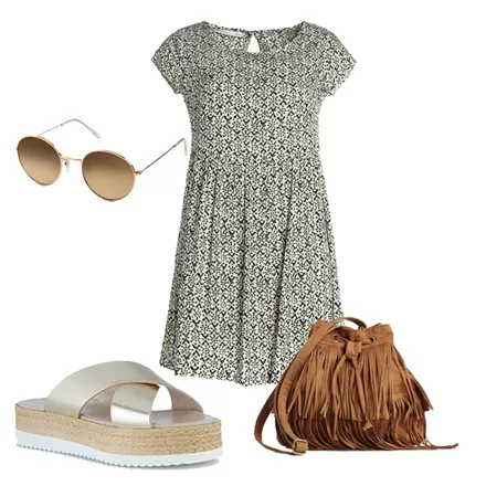 Φόρεμα, Helmi, από 54,90 ευρώ τώρα 38,43 ευρώ, helmi.grΧρυσά flatforms, Bozikis, από 39,99 ευρώ τώρα 29,99 ευρώ, bozikis.grΓυαλιά, H&M, 7,99 ευρώ, hm.comΤσάντα, H&M, 24,99 ευρώ, hm.com