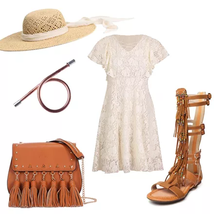 Δαντελένιο φόρεμα e-xclusive, 37 ευρώ (από 75), e-xclusive.comΔαχτυλίδι Helmi, 8,50 ευρώ, helmi.grGladiator σανδάλι MIGATO, 20 ευρώ (από 60), migato.comΤσάντα LYDC, 39 ευρώ, favela.grΨάθινο καπέλο H&M, 6,99 ευρώ (από 14,99), hm.com