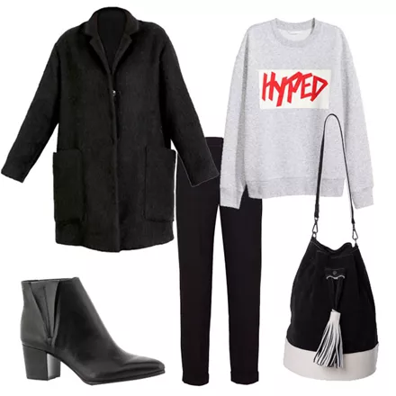Φούτερ, H&M, 19,99 ευρώ, hm.comΠαντελόνι, BSB, 69,90 ευρώ, bsbfashion.comΠαλτό, e-xclusive, από 170,00 τώρα 85,00 ευρώ, e-xclusive.comΜποτάκια, Vince Camuto, 199,00 ευρώ, kalogirou.comΤσάντα, Park House, από 250,00 τώρα 175,00 ευρώ, stylebubbles.com