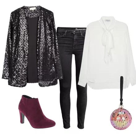 Σακάκι με παγιέτες χωρίς κούμπωμα, Lynne, 99.00 ευρώ, www.lynneshop.comΠουκάμισο με γραβάτα, BSB, 49.90 ευρώ, www.bsbfashion.comShaping Skinny Regular Jeans, H&M, 49.99 ευρώ, www.hm.comClutch Lydc – Sequins Ball, Favela, 28.00 ευρώ, www.favela.grΣουέτ μποτάκι, IQ shoes, 26.90 ευρώ, www.iqshoes.gr
