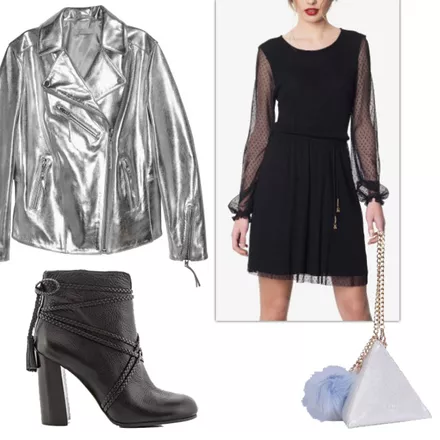 Φόρεμα από τούλι πουά Regalinas, 49,90 ευρώ, regalinas.grΔερμάτινο ασημί τζάκετ H&M, 249,00 ευρώ, hm.comΤσάντα σε σχήμα πυραμίδα Lydc, 24,00 ευρώ, favela.grΜποτάκι Vince Camuto, 229,00 ευρώ, kalogirou.com