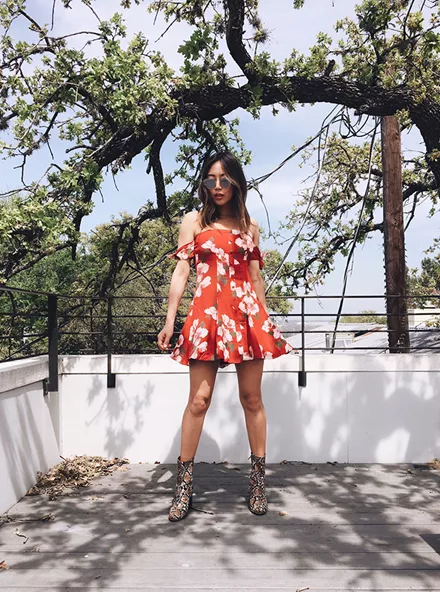 Η Aimee Song (Song of Style) φοράει το νέο φλοράλ (με μεγάλα άνθη σε έντονο φόντο που θυμίζει Gucci) σε ένα μίνι και έξωμο φόρεμα!