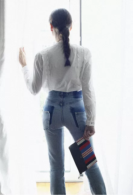 H Ευαγγελία (Style Heroine) επιλέγει ψηλόμεσο τζιν σε ίσια γραμμή και ένα prairie λευκό τοπ με δαντελένιες λεπτομέρειες.
