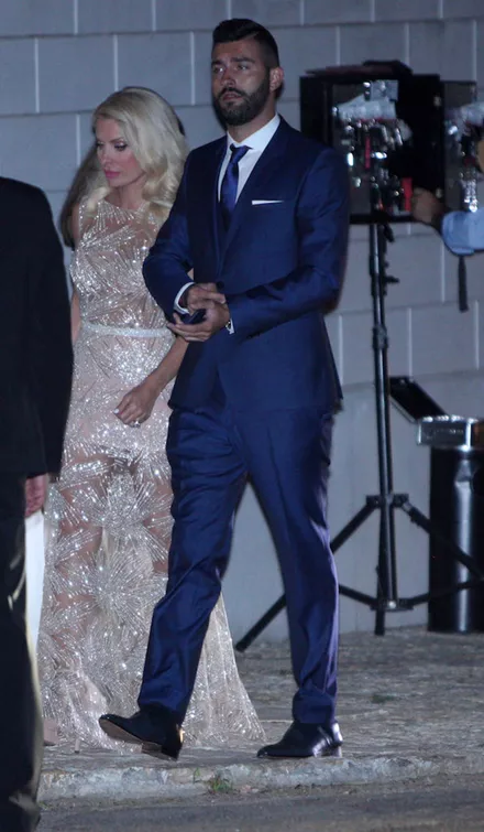 Στο γάμο του Σάκη Ρουβά και της Κάτιας Ζυγούλη με ένα maxi ροζ φόρεμα με διαφάνειες, δαντέλα και απεριόριστη λάμψη.