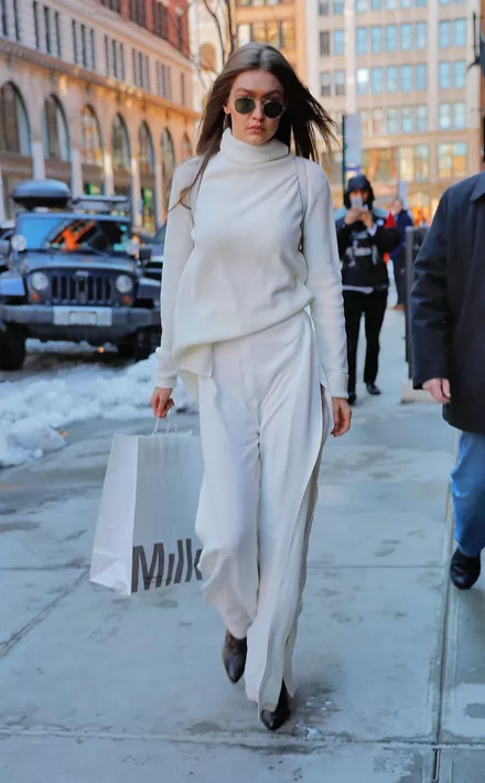 Με μία εμφάνιση της στη Νέα Υόρκη, η Gigi Hadid απέδειξε πως τίποτα δε φαίνεται πιο ακριβό από ένα ολόλευκο outfit, επιλέγοντας να φορέσει ένα λευκό, κασμιρένιο φούτερ με ταιριαζό φαρδύ παντελόνι. Το μοντέλο «αναβάθμισε» ακόμα περισσότερο το look της, επιλέγοντας ένα παντελόνι με σκισίματα στο πλάι και ολοκλήρωνοντας το ντύσιμο της με μπότες μέχρι το γόνατο.