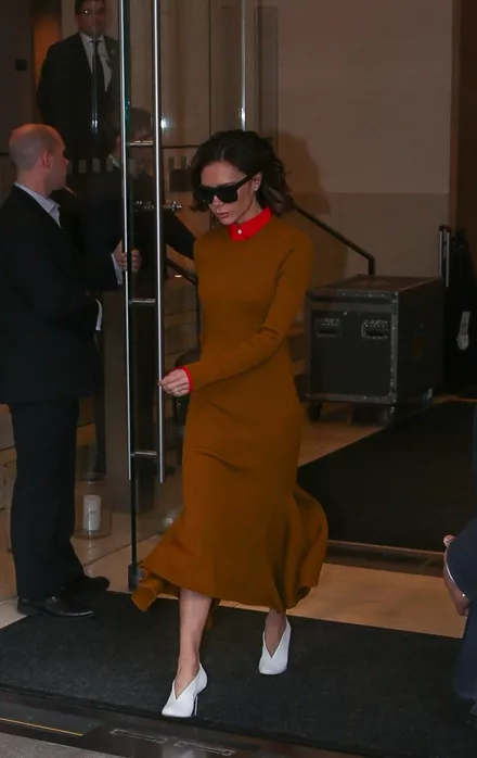 Victoria Beckham seen leaving her hotel, wearing brown dress.