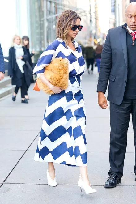 Victoria Beckham steps out wearing a Graphic Art Deco blue and white printed dress while carrying her Fur handbag in New york City