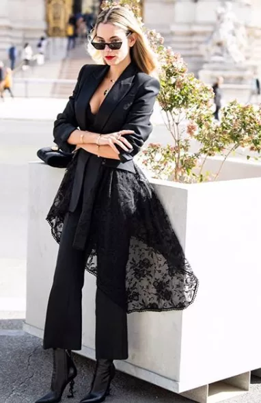 H αδερφή της Γωγώ στο show Zadig & Voltaire απόλυτα stylish με μαύρο ποδηλατικό κολάν, πέδιλα και μαύρο blazer.