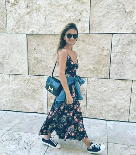 Η Mira Duma δένει το denim jacket της και στη μέση. Hint: Και φοράει μάξι φόρεμα με φλατ sneakers.