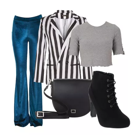 Σακάκι, Celestino, 14.95 ευρώ, www.celestino.grΒελουτέ παντελόνι, Pink Woman, 9.99 ευρώ από 29.99 ευρώ, pinkwoman-fashion.comΚοντό τοπ, 12 ευρώ από 24 ευρώ, www.e-xclusive.comΤσάντα, 19V69, 95 ευρώ από 135 ευρώ, sagiakos.grΜποτάκια, 19.90 ευρώ από 29.99 ευρώ, www.iqshoes.gr