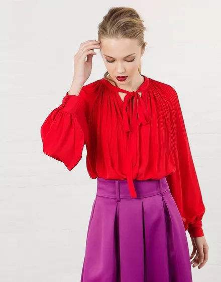 Δοκίμασε να συνδυάσεις δυναμικά την κόκκινη μπλούζα με μια μοβ φούστα!