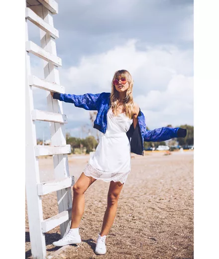 Η Ναταλία (Twin Fashion Blog) συνδυάζει δύο τάσεις του καλοκαιριού (το slip dress και το bomber jacket) με μεγάλη επιτυχία!