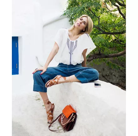 Η Έλενα (Cool UR Style) αναβάθμισε το "jeans and a T-shirt" look με ένα τοπ με φολκλόρ λεπτομέρειες.